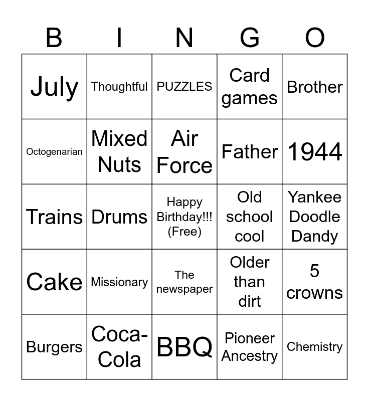 This bingo card has a free space and 42 words: Summer, Air Force, Dad, Missionary, Pioneer Ancestry, 5 crowns, Chemistry, Family History, PUZZLES, The newspaper, Yankee Doodle Dandy, 1944, Drums, Brother, Icecream, Older than dirt, Temple Square, Trains, Books, Thoughtful, Octogenarian, Church of Jesus Christ, BYU Football, July, The big 80, Fried shrimp, Father, Chess, UTAH, Hard worker, Chocolate, Cake, Mixed Nuts, BBQ, Gardening, Burgers, Coca-Cola, Old school cool, The train game, 100 degrees outside!, Card games and Math.