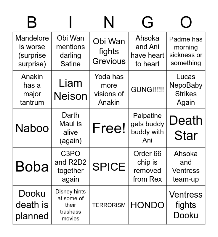 This bingo card has a free space and 24 words: C3PO and R2D2 together again, Disney hints at some of their trashass movies, Yoda has more visions of Anakin, Dooku death is planned, Padme has morning sickness or something, Mandelore is worse (surprise surprise), Anakin has a major tantrum, Obi Wan mentions darling Satine, Palpatine gets buddy buddy with Ani, SPICE, GUNGI!!!!!, Naboo, Order 66 chip is removed from Rex, Ahsoka and Ventress team-up, Liam Neison, HONDO, Death Star, Obi Wan fights Grevious, Lucas NepoBaby Strikes Again, Darth Maul is alive (again), Ventress fights Dooku, Boba, Ahsoka and Ani have heart to heart and TERRORISM.