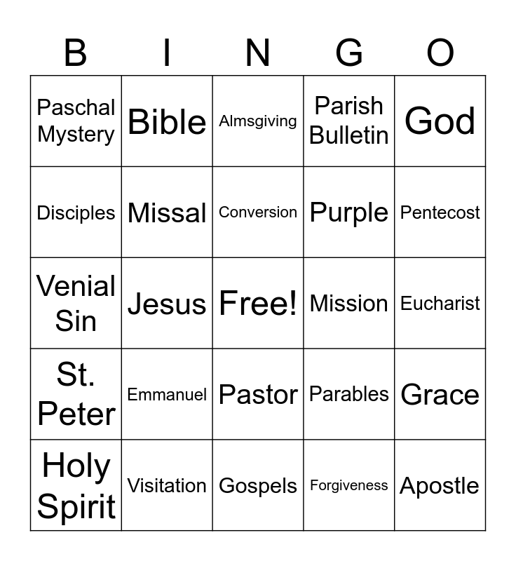 This bingo card has a free space and 49 words: Creed, Apostle, Scriptures, Gospels, Emmanuel, Abba, Bible, Community, Disciples, Holy Trinity, Missal, Parish Bulletin, Grace, Parables, Ten Commandments, Advent, Conversion, Mission, Monastery, God, Jesus, Forgiveness, Paschal Mystery, Purple, Green, Pentecost, Holy Spirit, Pope, Pastor, St. Peter, Sacramental, Rosary Beads, Crucifix, Annunciation, Visitation, Mary, Epiphany, Bethlehem, Eucharist, Baptism, Chrism, Communion, Epistles, Mortal Sin, Venial Sin, Almsgiving, Vocation, Intercession and Confirmation.