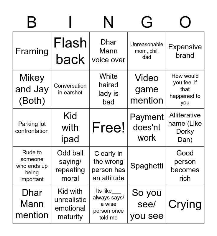 This bingo card has a free space and 43 words: The girl that cries, Crying, Dhar Mann Cam, Dhar Mann mention, Merch in vid, So you see/ you see, Dhar Mann voice over, Ps5, Expensive brand, Kid with unrealistic emotional maturity, Unreasonable mom, chill dad, Payment does'nt work, Clearly in the wrong person has an attitude, Odd ball saying/ repeating moral, Person changes their ways instantly, Its like___ always says/ a wise person once told me, Someone who was constantly warning and teaching was cast aside but then main character realizes they were helping, Parking lot confrontation, Bad/ homemade props, How would you feel if that happened to you, Flash back, Time skip, Cheating/ sabotage, Framing, Useless Adults, Alliterative name (Like Dorky Dan), Extreme coincidence, Extreme conclusion or accusation, Spaghetti, Rude to someone who ends up being important, Bad person becomes poor, Good person becomes rich, You guess plot, Kid with ipad, iPhone mention, Popular vs nerd, Karma, White haired lady is bad, Mikey and Jay (Both), Video game mention, Secret rich person, Conversation in earshot and Montage.