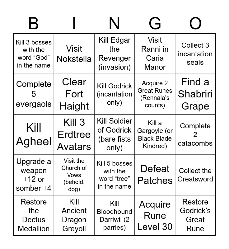 This bingo card has a free space and 24 words: Visit the Church of Vows (behold, dog), Kill Ancient Dragon Greyoll, Kill Godrick (incantation only), Restore the Dectus Medallion, Collect 3 incantation seals, Kill 3 bosses with the word “God” in the name, Complete 5 evergaols, Visit Nokstella, Kill a Gargoyle (or Black Blade Kindred), Kill 5 bosses with the word “tree” in the name, Acquire 2 Great Runes (Rennala’s counts), Kill Agheel, Defeat Patches, Collect the Greatsword, Clear Fort Haight, Acquire Rune Level 30, Complete 2 catacombs, Kill Edgar the Revenger (invasion), Find a Shabriri Grape, Kill 3 Erdtree Avatars, Restore Godrick’s Great Rune, Upgrade a weapon +12 or somber +4, Visit Ranni in Caria Manor and Kill Bloodhound Darriwil (2 parries).