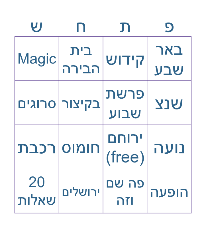 This bingo card has 17 words: פה שם וזה, 20 שאלות, קידוש, Magic, חומוס, באר שבע, נועה, פרשת שבוע, שנצ, בקיצור, ירושלים, ירוחם (free), סרוגים, בית הבירה, רכבת, אוטובוס and הופעה.