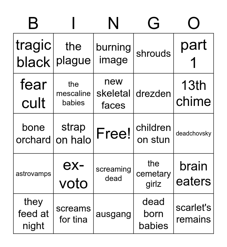 This bingo card has a free space and 24 words: ex-voto, screams for tina, new skeletal faces, they feed at night, part 1, tragic black, fear cult, the plague, children on stun, screaming dead, drezden, bone orchard, the cemetary girlz, brain eaters, the mescaline babies, dead born babies, deadchovsky, burning image, 13th chime, strap on halo, scarlet's remains, astrovamps, shrouds and ausgang.