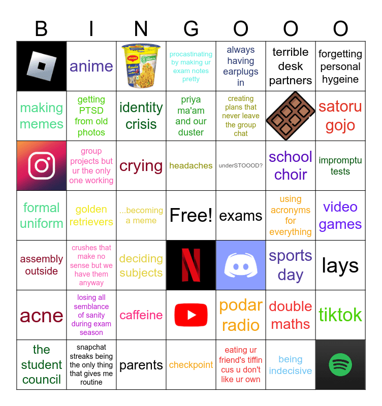 This bingo card has 10 images, a free space and 45 words: eating ur friend's tiffin cus u don't like ur own, impromptu tests, plans for the future changing daily, golden retrievers, losing all semblance of sanity during exam season, forgetting personal hygeine, getting PTSD from old photos, caffeine, procastinating by making ur exam notes pretty, lays, video games, using acronyms for everything, the student council, assembly outside, always having earplugs in, creating plans that never leave the group chat, being indecisive, satoru gojo, crushes that make no sense but we have them anyway, underSTOOOD?, k-pop being the only thing to fangirl over, making memes, ...becoming a meme, valorant bans, school choir, peter johnson, sports day, tiktok, snapchat streaks being the only thing that gives me routine, terrible desk partners, priya ma'am and our duster, acne, group projects but ur the only one working, deciding subjects, anime, podar radio, annual day, crying, formal uniform, parents, exams, identity crisis, double maths, checkpoint and headaches.