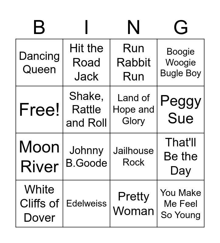 This bingo card has 45 words: Que Sera, White Cliffs of Dover, Delilah, It's a Long Way to Tipperary, That's Amore, Fly Me to the Moon, Run Rabbit Run, Down at the Old Bull and Bush, Free!, Danny Boy, Boogie Woogie Bugle Boy, Edelweiss, Somewhere over the Rainbow, Moonlight Serenade, What a Wonderful World, Sentimental Journey, Chattanooga Choo Choo, Jailhouse Rock, Swinging on a Star, Johnny B.Goode, Hit the Road Jack, Can't Take My Eyes off You, I Heard it through the Grapevine, Dancing Queen, Sweet Caroline, Pretty Woman, ABC, Dream Lover, Hound Dog, You Make Me Feel So Young, Beyond The Sea, Cheek to Cheek, Mr Sandman, All I Have To Do Is Dream, Stupid Cupid, That'll Be the Day, Bye Bye Love, Papa Loves Mambo, Love Me Tender, Peggy Sue, Shake, Rattle and Roll, Moon River, It's Not Unusual, Land of Hope and Glory and Roll Out The Barrel.