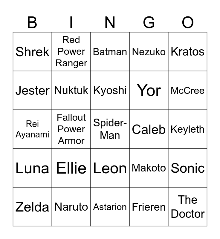 This bingo card has a free space and 24 words: Ellie, Naruto, Kyoshi, Zelda, Kratos, Shrek, Jester, Red Power Ranger, Caleb, Leon, Yor, Rei Ayanami, Makoto, Sonic, Nuktuk, Frieren, Keyleth, Batman, McCree, Fallout Power Armor, The Doctor, Luna, Nezuko and Astarion.