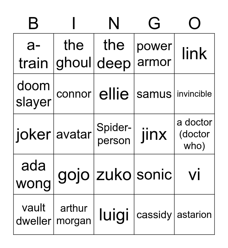 This bingo card has a free space and 24 words: gojo, arthur morgan, ellie, vault dweller, link, a-train, doom slayer, the ghoul, jinx, zuko, samus, joker, sonic, vi, connor, cassidy, a doctor (doctor who), the deep, invincible, avatar, astarion, ada wong, power armor and luigi.