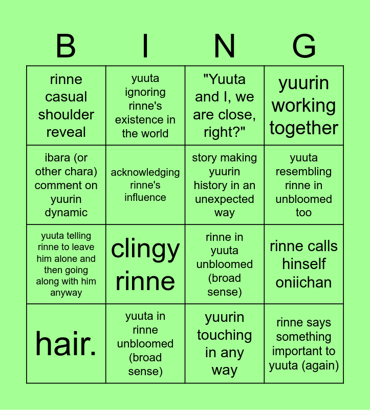 This bingo card has 16 words: yuuta in rinne unbloomed (broad sense), rinne calls hinself oniichan, "Yuuta and I, we are close, right?", rinne casual shoulder reveal, yuuta telling rinne to leave him alone and then going along with him anyway, yuuta ignoring rinne's existence in the world, rinne in yuuta unbloomed (broad sense), yuurin touching in any way, ibara (or other chara) comment on yuurin dynamic, acknowledging rinne's influence, hair., yuurin working together, clingy rinne, yuuta resembling rinne in unbloomed too, story making yuurin history in an unexpected way and rinne says something important to yuuta (again).