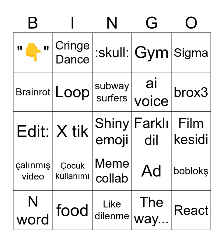 This bingo card has 25 words: Çocuk kullanımı, Like dilenme, subway surfers, N word, Sigma, "👇", Brainrot, Cringe Dance, Farklı dil, Meme collab, ai voice, Edit:, Ad, boblokş, Loop, React, Film kesidi, :skull:, brox3, X tik, Shiny emoji, food, çalınmış video, Gym and The way....