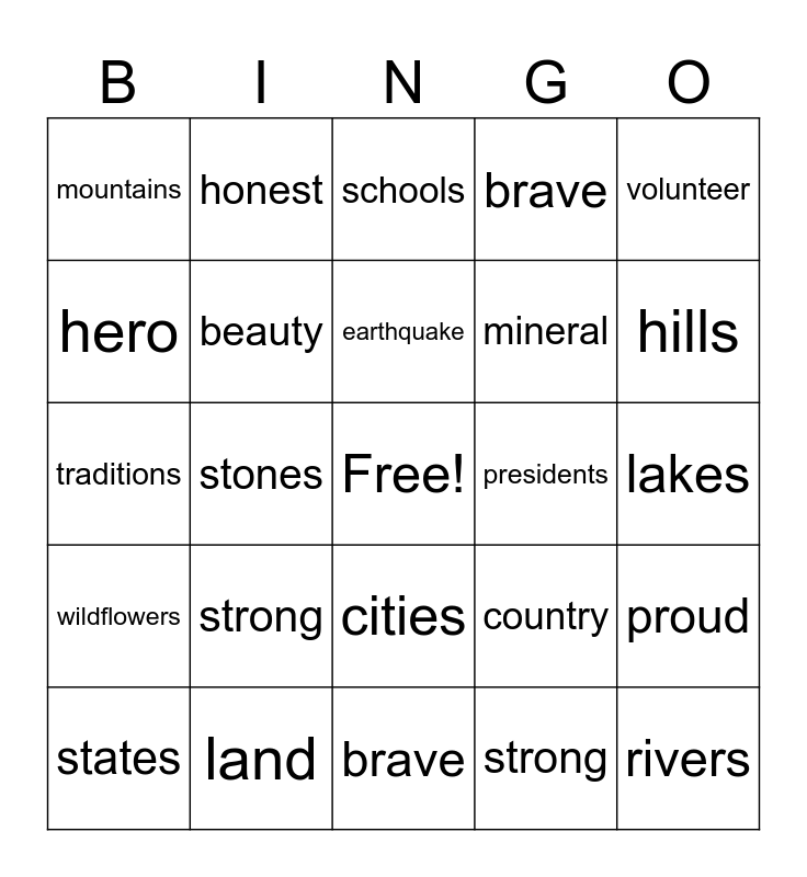 This bingo card has a free space and 25 words: strong, brave, earthquake, states, volunteer, mountains, hero, honest, presidents, cities, mineral, traditions, country, proud, beauty, forests, lakes, schools, hills, stones, rivers, land, wildflowers, brave and strong.