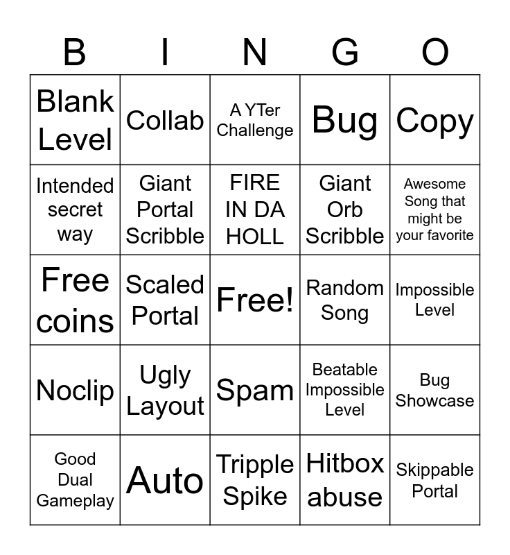 This bingo card has a free space and 24 words: Ugly Layout, Auto, FIRE IN DA HOLL, Good Dual Gameplay, Copy, Blank Level, Intended secret way, Collab, Random Song, Spam, Giant Orb Scribble, Free coins, Beatable Impossible Level, Bug Showcase, Giant Portal Scribble, Hitbox abuse, Impossible Level, A YTer Challenge, Awesome Song that might be your favorite, Scaled Portal, Skippable Portal, Noclip, Bug and Tripple Spike.