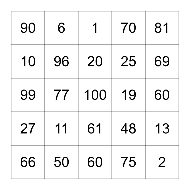 This bingo card has a free space and 24 words: 11, 50, 20, 66, 81, 90, 10, 6, 19, 61, 25, 99, 48, 13, 96, 75, 60, 1, 69, 77, 2, 27, 70 and 60.