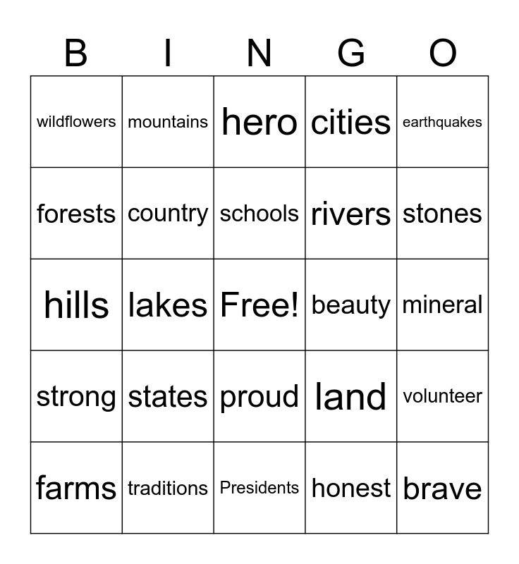 This bingo card has a free space and 24 words: states, traditions, schools, farms, earthquakes, wildflowers, forests, mountains, beauty, proud, rivers, hills, land, volunteer, country, honest, mineral, hero, stones, lakes, brave, strong, cities and Presidents.