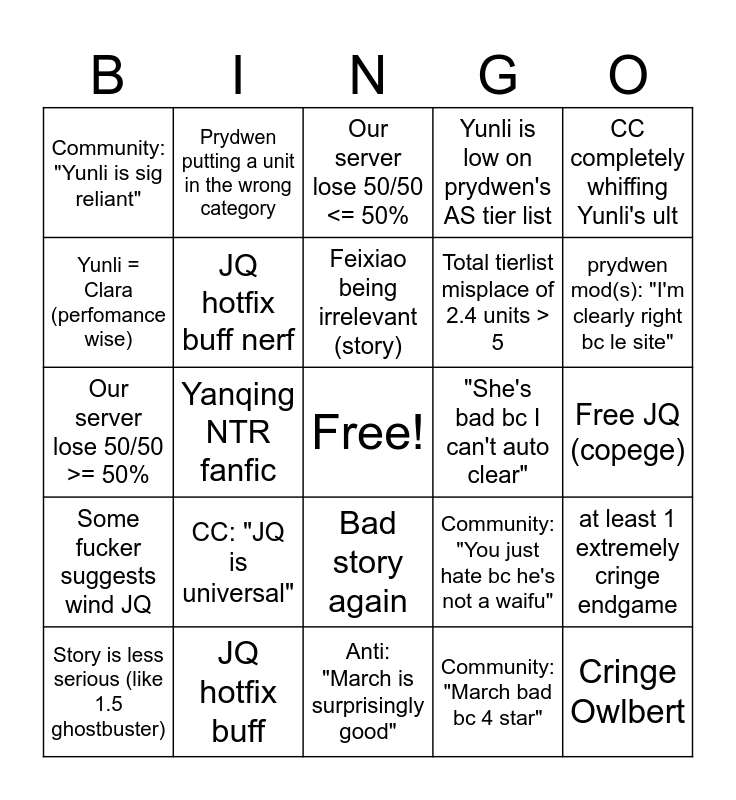 This bingo card has a free space and 24 words: CC: "JQ is universal", JQ hotfix buff, Feixiao being irrelevant (story), Story is less serious (like 1.5 ghostbuster), CC completely whiffing Yunli's ult, Community: "Yunli is sig reliant", Yunli = Clara (perfomance wise), Prydwen putting a unit in the wrong category, "She's bad bc I can't auto clear", Bad story again, Total tierlist misplace of 2.4 units > 5, Our server lose 50/50 >= 50%, Community: "You just hate bc he's not a waifu", at least 1 extremely cringe endgame, JQ hotfix buff nerf, Community: "March bad bc 4 star", Free JQ (copege), Our server lose 50/50 <= 50%, prydwen mod(s): "I'm clearly right bc le site", Yanqing NTR fanfic, Cringe Owlbert, Some fucker suggests wind JQ, Yunli is low on prydwen's AS tier list and Anti: "March is surprisingly good".