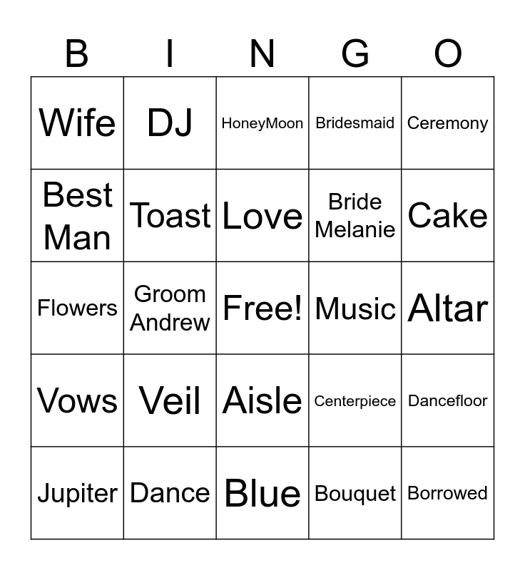 This bingo card has a free space and 29 words: Jupiter, Gown, Groom Andrew, Ring, Wife, HoneyMoon, Toast, Veil, Music, Dance, Altar, Borrowed, Blue, Bouquet, Cake, Gifts, Aisle, Vows, Ceremony, Flowers, Centerpiece, Reception, Bride Melanie, Best Man, Bridesmaid, DJ, Dancefloor, Love and Boutonniere.