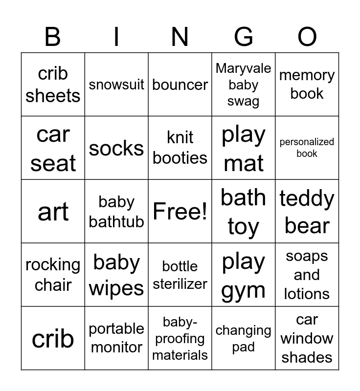 This bingo card has a free space and 85 words: bottle warmer, nightlight, bouncer, sound machine, baby monitor, baby bottles, highchair, towels, diaper pail, blanket, rocker, swaddle, socks, bath toy, burb cloth, crib sheets, crib, car seat, diaper bag, swaddle, stroller, play mat, car window shades, pacifier, baby bathtub, washcloths, baby grooming kit, baby carrier, baby wrap, pack 'n play, baby wipes, diapers, baby wipe warmer, art, crib mattress, baby blanket, baby-proofing materials, monthly milestone blanket, rocking chair, personalized book, humidifier, photo frame, mobile, baby bath kit, first aid kit, handmade clothes, travel crib, high chair, bassinet, sun hat, snowsuit, knit booties, stuffed animal, toybox, storage boxes, activity mat, portable monitor, Maryvale baby swag, University of Dayton baby swag, baby hand- and footprint kit, sleep sack, slippers, robe, breastfeeding supplies, nursing cover, memory book, baby file folder, soaps and lotions, scented candle, changing table, clothing, teething toys, bibs, baby utensils, baby food maker, bottle sterilizer, changing pad, stroller accessory, toys, gift certificate, teddy bear, bottle washer, breast pump, play gym and diaper caddy.