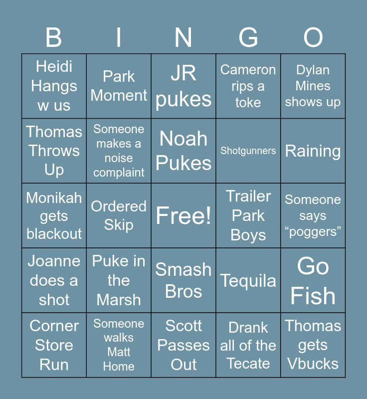 This bingo card has a free space and 24 words: Puke in the Marsh, Someone walks Matt Home, Noah Pukes, Corner Store Run, Dylan Mines shows up, Heidi Hangs w us, Thomas Throws Up, Park Moment, Trailer Park Boys, Smash Bros, Shotgunners, Monikah gets blackout, Tequila, Go Fish, Someone makes a noise complaint, Drank all of the Tecate, Someone says “poggers”, JR pukes, Raining, Ordered Skip, Thomas gets Vbucks, Joanne does a shot, Cameron rips a toke and Scott Passes Out.