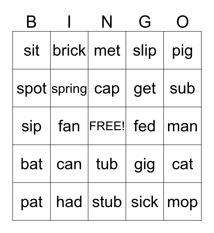 This bingo card has a free space and 24 words: can, had, cap, pat, pig, sit, spot, brick, fed, tub, get, sip, gig, cat, spring, sick, man, met, sub, fan, mop, bat, slip and stub.
