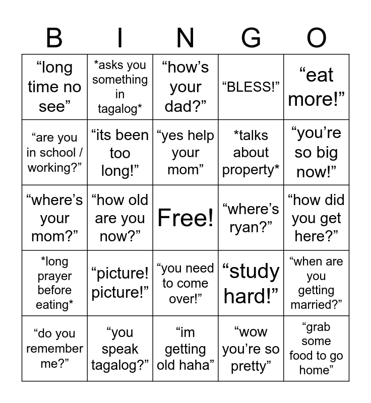 This bingo card has a free space and 24 words: “picture! picture!”, “you speak tagalog?”, “yes help your mom”, “do you remember me?”, “eat more!”, “long time no see”, “are you in school / working?”, *asks you something in tagalog*, “where’s ryan?”, “you need to come over!”, *talks about property*, “where’s your mom?”, “study hard!”, “when are you getting married?”, “its been too long!”, “wow you’re so pretty”, “how did you get here?”, “how’s your dad?”, “you’re so big now!”, “how old are you now?”, “grab some food to go home”, *long prayer before eating*, “BLESS!” and “im getting old haha”.