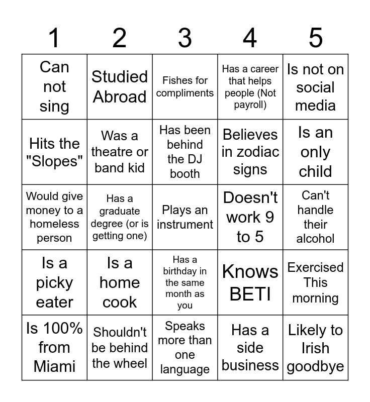 This bingo card has 25 words: Is a home cook, Speaks more than one language, Has been behind the DJ booth, Is 100% from Miami, Is not on social media, Can not sing, Hits the "Slopes", Studied Abroad, Doesn't work 9 to 5, Has a birthday in the same month as you, Believes in zodiac signs, Would give money to a homeless person, Knows BETI, Exercised This morning, Was a theatre or band kid, Likely to Irish goodbye, Can't handle their alcohol, Fishes for compliments, Is an only child, Has a graduate degree (or is getting one), Plays an instrument, Shouldn't be behind the wheel, Is a picky eater, Has a career that helps people (Not payroll) and Has a side business.