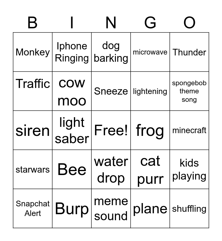 This bingo card has a free space and 24 words: Bee, Burp, Sneeze, Snapchat Alert, Thunder, Monkey, Traffic, Iphone Ringing, frog, water drop, lightening, siren, cat purr, kids playing, cow moo, plane, minecraft, dog barking, spongebob theme song, light saber, shuffling, starwars, microwave and meme sound.