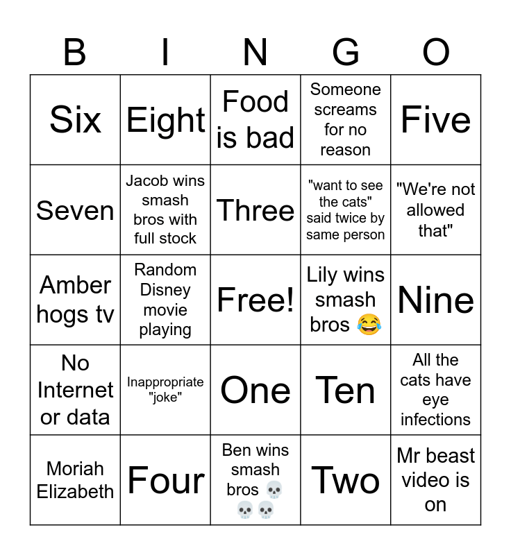 This bingo card has a free space and 26 words: One, Two, Three, Four, Five, Six, Seven, Eight, Nine, Ten, "want to see the cats" said twice by same person, Amber hogs tv, All the cats have eye infections, Moriah Elizabeth, Random Disney movie playing, Amber and Megan fight over literally anything, Someone screams for no reason, No Internet or data, Food is bad, Mr beast video is on, "We're not allowed that", Ben wins smash bros 💀💀💀, Lily wins smash bros 😂, Inappropriate "joke", Jacob wins smash bros with full stock and Amber or Megan has some new annoying toy to play with.