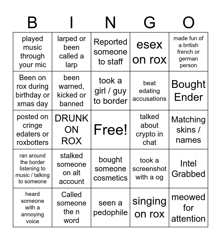 This bingo card has a free space and 36 words: WIN A TOURNEY, 10d someone, Dox Threatened / been threatened, been warned, kicked or banned, took a screenshot with a og, ran around the border listening to music / talking to someone, took a girl / guy to border, HAD BEEF ON ROX, made fun of a british french or german person, played on a OG account on rox, DRUNK ON ROX, esex on rox, begged for cosmetics, talked about crypto in chat, Bought Ender, played music through your mic, Voice Changer on Rox, stalked someone on alt account, meowed for attention, Reported someone to staff, Matching skins / names, Intel Grabbed, Called someone the n word, heard someone with a annoying voice, seen a pedophile, larped or been called a larp, posted on cringe edaters or roxbotters, made fun of taybabie, beat edating accusations, Been on rox during birthday or xmas day, ban evaded, mod abuse, singing on rox, bought someone cosmetics, kb item / cookie and chicken mid fight.