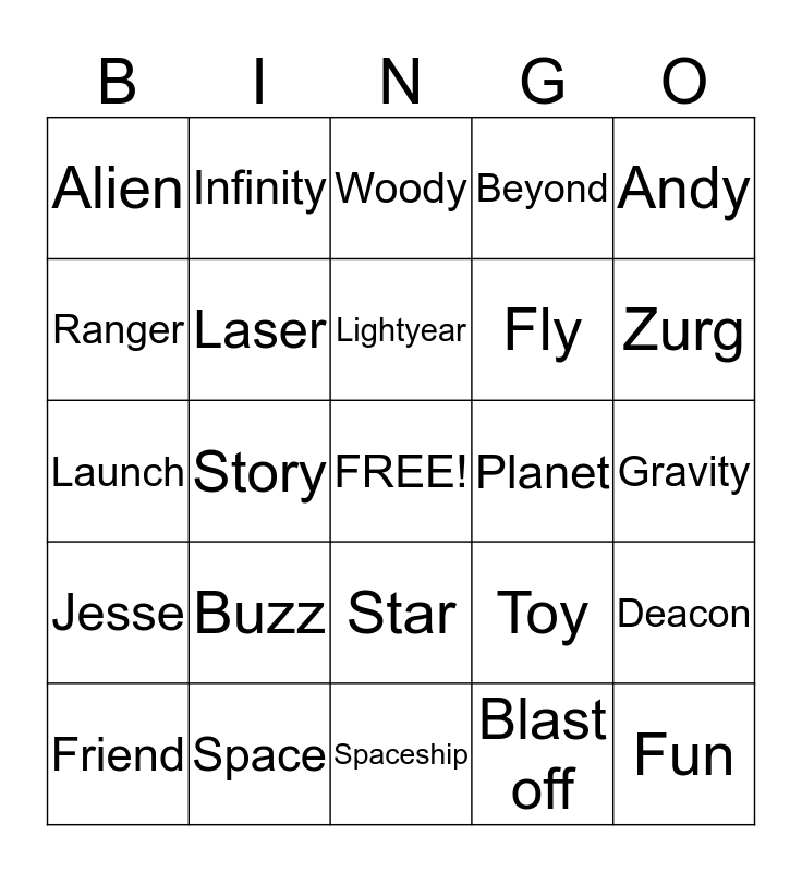 This bingo card has a free space and 24 words: Buzz, Space, Lightyear, Friend, Andy, Alien, Ranger, Infinity, Planet, Star, Fly, Launch, Toy, Deacon, Laser, Blast off, Gravity, Woody, Zurg, Story, Fun, Jesse, Beyond and Spaceship.