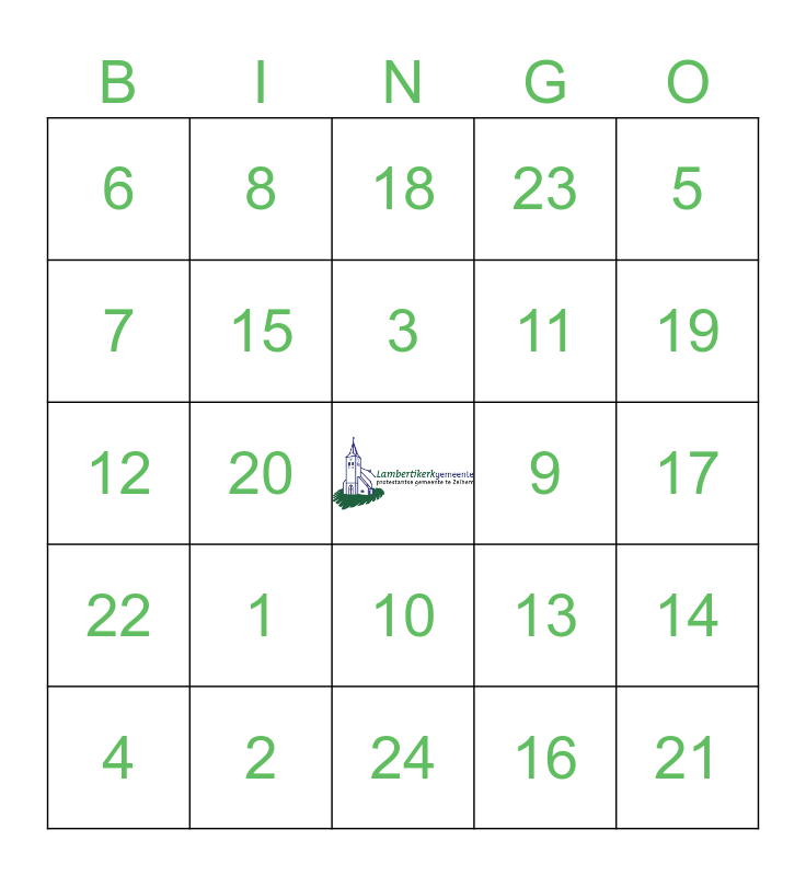 This bingo card has a free space and 24 words: 1, 2, 3, 4, 5, 6, 7, 8, 9, 10, 11, 12, 13, 14, 15, 16, 17, 18, 19, 20, 21, 22, 23 and 24.