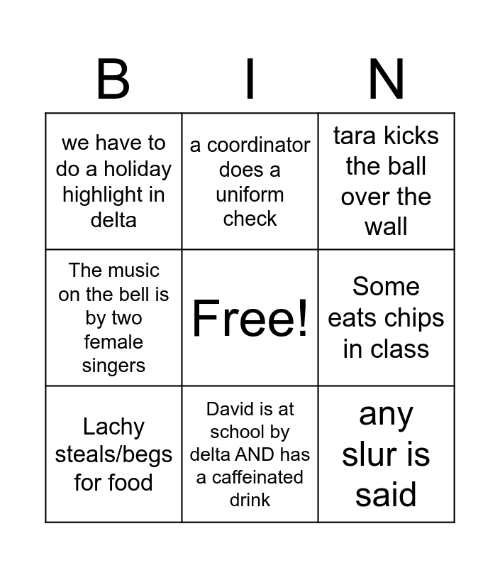 This bingo card has a free space and 8 words: Some eats chips in class, tara kicks the ball over the wall, a coordinator does a uniform check, Lachy steals/begs for food, we have to do a holiday highlight in delta, any slur is said, The music on the bell is by two female singers and David is at school by delta AND has a caffeinated drink.