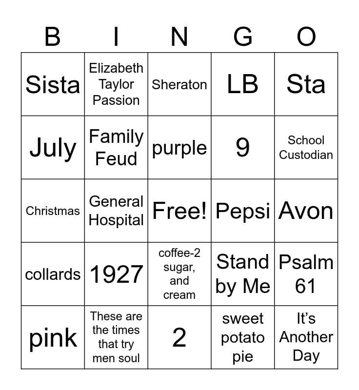 This bingo card has a free space and 25 words: 1927, 2, purple, pink, Sta, Sista, July, Elizabeth Taylor Passion, Pepsi, coffee-2 sugar, and cream, 9, Christmas, Stand by Me, Psalm 61, Family Feud, Man from Snowy River, Avon, Sheraton, School Custodian, General Hospital, It’s Another Day, These are the times that try men soul, collards, LB and sweet potato pie.