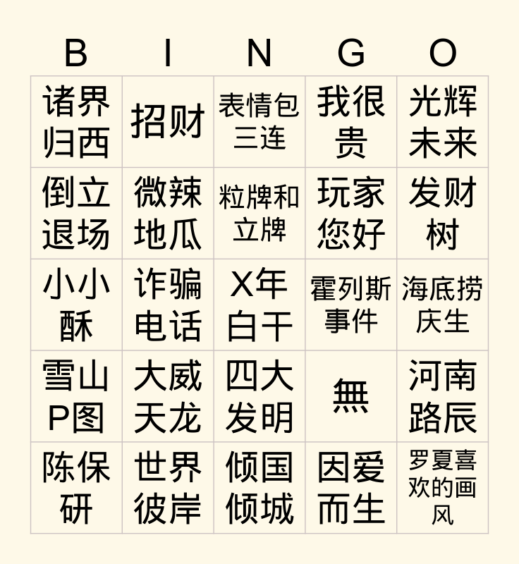 This bingo card has 25 words: 大威天龙, 倾国倾城, 粒牌和立牌, 陈保研, 光辉未来, 诸界归西, 倒立退场, 招财, 霍列斯事件, 四大发明, 玩家您好, 小小酥, 無, 河南路辰, 微辣地瓜, 罗夏喜欢的画风, 海底捞庆生, 表情包三连, 发财树, 诈骗电话, X年白干, 世界彼岸, 雪山P图, 我很贵 and 因爱而生.