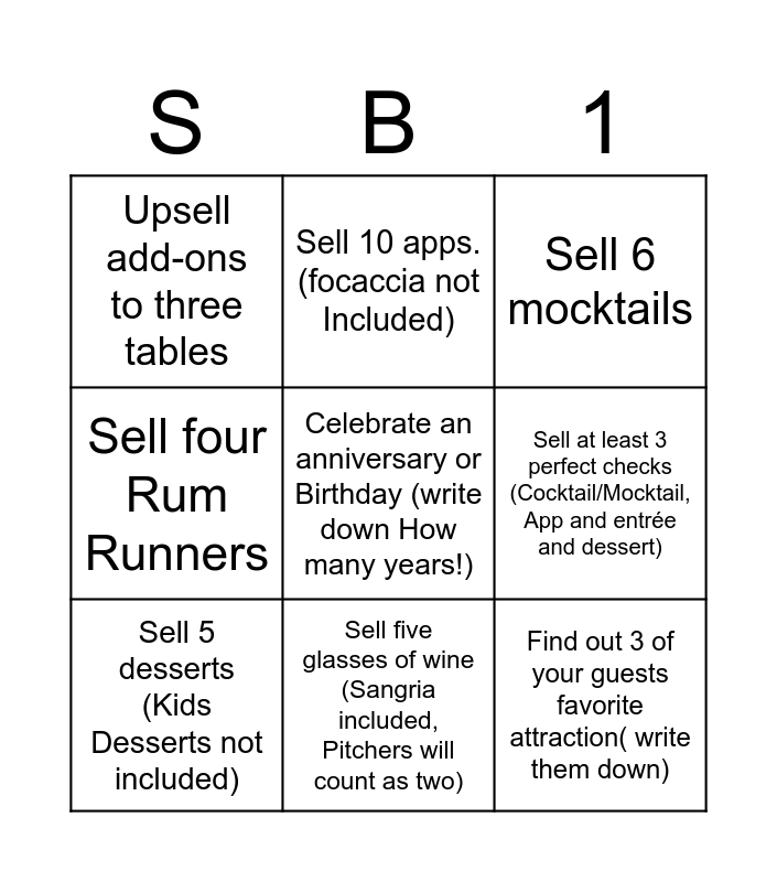 This bingo card has a free space and 8 words: Sell at least 3 perfect checks (Cocktail/Mocktail, App and entrée and dessert), Sell 6 mocktails, Sell 10 apps. (focaccia not Included), Sell 5 desserts (Kids Desserts not included), Upsell add-ons to three tables, Find out 3 of your guests favorite attraction( write them down), Sell four Rum Runners and Sell five glasses of wine (Sangria included, Pitchers will count as two).