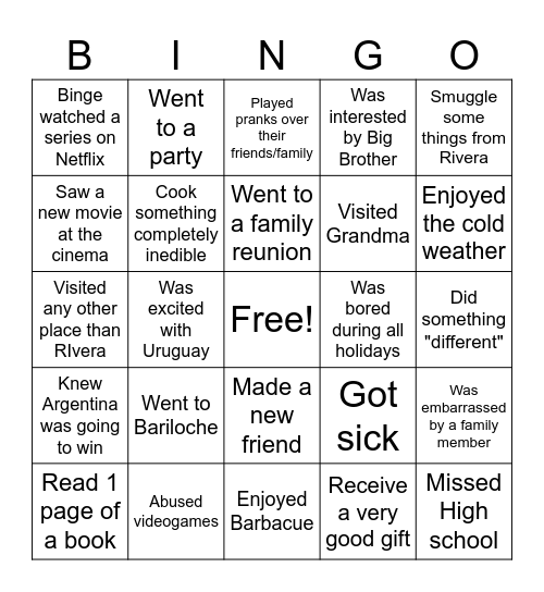 This bingo card has a free space and 24 words: Went to Bariloche, Abused videogames, Went to a family reunion, Read 1 page of a book, Smuggle some things from Rivera, Binge watched a series on Netflix, Saw a new movie at the cinema, Went to a party, Was bored during all holidays, Made a new friend, Visited Grandma, Visited any other place than RIvera, Got sick, Was embarrassed by a family member, Cook something completely inedible, Receive a very good gift, Did something "different", Played pranks over their friends/family, Enjoyed the cold weather, Was excited with Uruguay, Missed High school, Knew Argentina was going to win, Was interested by Big Brother and Enjoyed Barbacue.