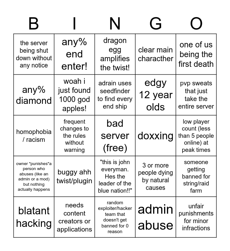 This bingo card has a free space and 28 words: someone getting banned for string/raid farm, everyone runs away, edgy 12 year olds, admin abuse, any% diamond, dragon egg amplifies the twist!, any% end enter!, owner "punishes"a person who abuses (like an admin or a mod) but nothing actually happens, doxxing, blatant hacking, homophobia / racism, clear main characther, needs content creators or applications, random exploiter/hacker team that doesn't get banned for 0 reason, pvp sweats that just take the entire server, random guy who just grinds neth day 2, buggy ahh twist/plugin, woah i just found 1000 god apples!, adrain uses seedfinder to find every end ship, "this is john everyman. Hes the leader of the blue nation!!", the server being shut down without any notice, comical lag, unfair punishments for minor infractions, frequent changes to the rules without warning, low player count (less than 5 people online) at peak times, 3 or more people dying by natural causes, one of us being the first death and clearly scripted.