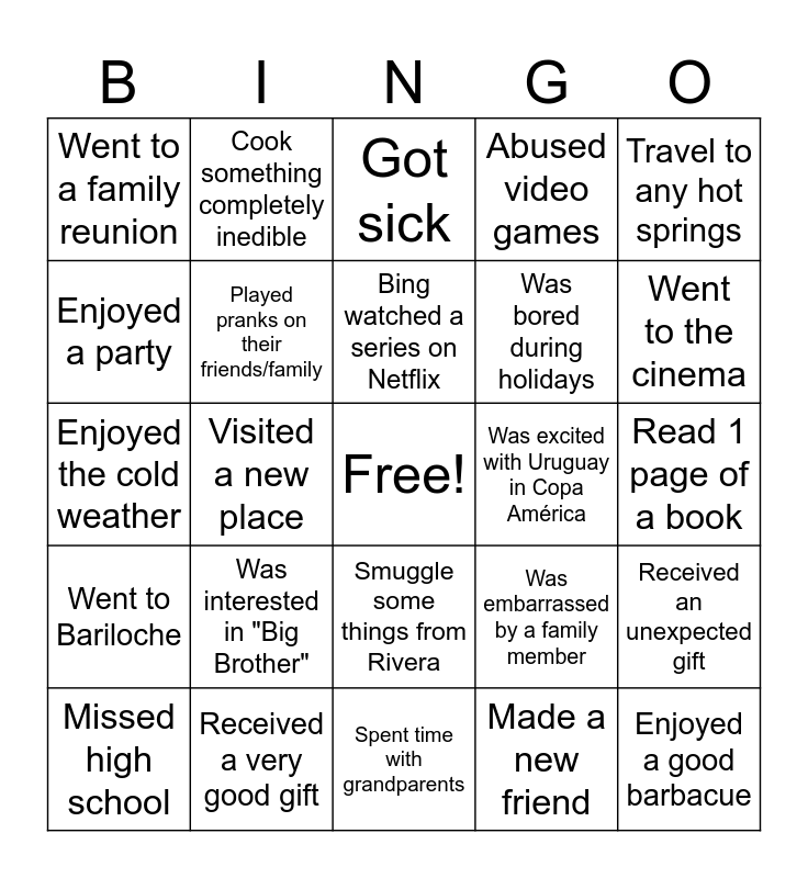 This bingo card has a free space and 24 words: Was interested in "Big Brother", Received a very good gift, Bing watched a series on Netflix, Missed high school, Travel to any hot springs, Went to a family reunion, Enjoyed a party, Cook something completely inedible, Was excited with Uruguay in Copa América, Smuggle some things from Rivera, Was bored during holidays, Enjoyed the cold weather, Was embarrassed by a family member, Received an unexpected gift, Played pranks on their friends/family, Made a new friend, Read 1 page of a book, Got sick, Went to the cinema, Visited a new place, Enjoyed a good barbacue, Went to Bariloche, Abused video games and Spent time with grandparents.