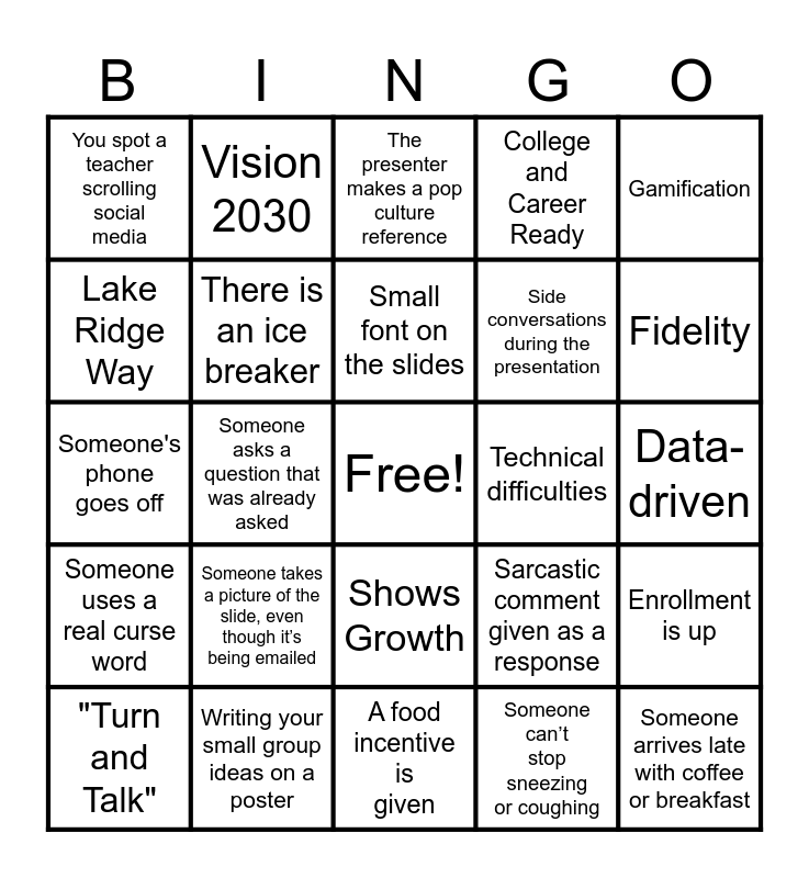 This bingo card has a free space and 29 words: "Turn and Talk", "Let's break into small groups", Someone asks a question that was already asked, A teacher nods off, You spot a teacher scrolling social media, The presenter makes a pop culture reference, There is an ice breaker, Someone takes a picture of the slide, even though it’s being emailed, Technical difficulties, Writing your small group ideas on a poster, Data-driven, Someone arrives late with coffee or breakfast, A food incentive is given, Someone can’t stop sneezing or coughing, Fidelity, Student-Centered, Shows Growth, Someone uses a real curse word, Gamification, Someone's phone goes off, Sarcastic comment given as a response, New district/ school policy unleashed, Side conversations during the presentation, Lake Ridge Way, College and Career Ready, Vision 2030, Enrollment is up, Small font on the slides and PLC.