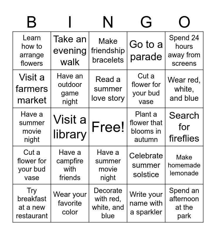 This bingo card has a free space and 82 words: Bake a dessert with fresh berries, Search for wildflowers, Make friendship bracelets, Take an evening walk, Try a new sandwich, Read a summer love story, Try a new ice cream flavor, Go to an outdoor concert, Make an orange julius, Dip your feet in the water, Search for fireflies, Wear your favorite color, Have an outdoor game night, Plant a flower that blooms in autumn, Have a campfire with friends, Learn how to arrange flowers, Try breakfast at a new restaurant, Visit a farmers market, Celebrate summer solstice, Plant a windowsill garden, Thrift a bud vase, Cut a flower for your bud vase, Spend an afternoon at the park, Spend 24 hours away from screens, Visit a library, Try a recipe with edible flowers, Read a book under a tree, Visit a local fair, Make a summer playlist, Go berry picking, Have a campfire with friends, Display an American Flag outside, Have a summer movie night, Write your name with a sparkler, Bake star shaped cookies, Decorate with red, white, and blue, Watch a fireworks show, Try a new ice cream flavor, Wear red, white, and blue, Make homemade popsicles, Make homemade lemonade, Go to a parade, Bake a dessert with fresh berries, Search for wildflowers, Make friendship bracelets, Take an evening walk, Try a new sandwich, Read a summer love story, Go to an outdoor concert, Make an orange julius, Dip your feet in the water, Search for fireflies, Wear your favorite color, Have an outdoor game night, Plant a flower that blooms in autumn, Have a campfire with friends, Learn how to arrange flowers, Try breakfast at a new restaurant, Visit a farmers market, Celebrate summer solstice, Plant a windowsill garden, Thrift a bud vase, Cut a flower for your bud vase, Spend an afternoon at the park, Spend 24 hours away from screens, Visit a library, Try a recipe with edible flowers, Read a book under a tree, Visit a local fair, Make a summer playlist, Go berry picking, Display an American Flag outside, Have a summer movie night, Write your name with a sparkler, Bake star shaped cookies, Decorate with red, white, and blue, Watch a fireworks show, Try a new ice cream flavor, Wear red, white, and blue, Make homemade popsicles, Make homemade lemonade and Go to a parade.