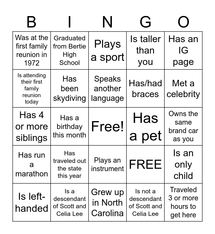 This bingo card has a free space and 25 words: Has traveled out the state this year, Grew up in North Carolina, Speaks another language, Is left-handed, Has an IG page, Was at the first family reunion in 1972, Is attending their first family reunion today, Graduated from Bertie High School, Has a pet, Plays an instrument, Has/had braces, Has 4 or more siblings, FREE, Is an only child, Has been skydiving, Has a tattoo, Owns the same brand car as you, Plays a sport, Met a celebrity, Has a birthday this month, Traveled 3 or more hours to get here, Is a descendant of Scott and Celia Lee, Has run a marathon, Is taller than you and Is not a descendant of Scott and Celia Lee.