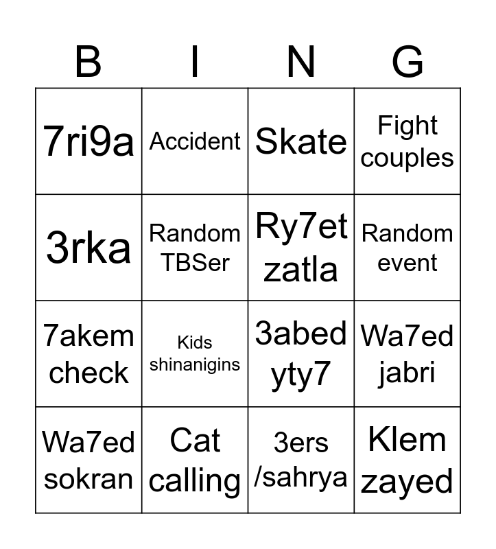 This bingo card has 16 words: Cat calling, Wa7ed jabri, Skate, 7ri9a, 7akem check, Accident, 3abed yty7, 3ers /sahrya, 3rka, Random TBSer, Wa7ed sokran, Fight couples, Kids shinanigins, Random event, Ry7et zatla and Klem zayed.