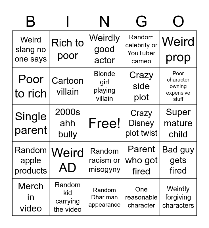 This bingo card has a free space and 24 words: Weird AD, Random kid carrying the video, Blonde girl playing villain, Merch in video, Weird prop, Weird slang no one says, Poor to rich, Rich to poor, Crazy Disney plot twist, Random racism or misogyny, Crazy side plot, Single parent, Parent who got fired, Bad guy gets fired, Cartoon villain, One reasonable character, Super mature child, Weirdly good actor, Poor character owning expensive stuff, 2000s ahh bully, Weirdly forgiving characters, Random apple products, Random celebrity or YouTuber cameo and Random Dhar man appearance.