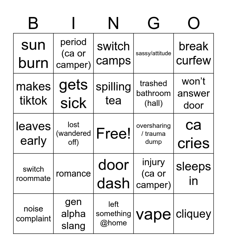 This bingo card has a free space and 24 words: romance, gen alpha slang, spilling tea, noise complaint, break curfew, sun burn, makes tiktok, period (ca or camper), oversharing / trauma dump, door dash, trashed bathroom (hall), leaves early, injury (ca or camper), sleeps in, gets sick, vape, ca cries, switch camps, won’t answer door, lost (wandered off), cliquey, switch roommate, sassy/attitude and left something @home.