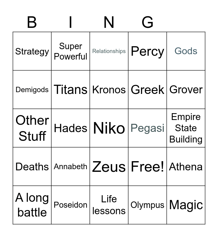 This bingo card has 25 words: Annabeth, Life lessons, Kronos, A long battle, Gods, Strategy, Demigods, Super Powerful, Pegasi, Zeus, Greek, Other Stuff, Free!, Athena, Titans, Magic, Empire State Building, Relationships, Grover, Hades, Niko, Poseidon, Deaths, Percy and Olympus.