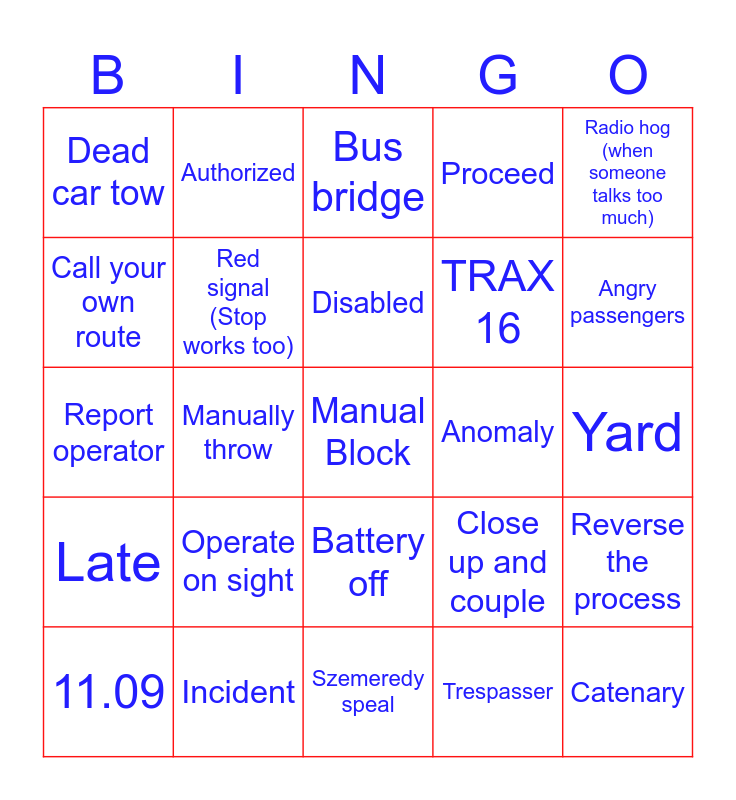 This bingo card has a free space and 24 words: 11.09, Operate on sight, Disabled, Trespasser, Radio hog (when someone talks too much), Dead car tow, Authorized, Bus bridge, Anomaly, Yard, Report operator, Red signal (Stop works too), Close up and couple, Reverse the process, Call your own route, Incident, Szemeredy speal, Proceed, Angry passengers, Late, Manually throw, Battery off, TRAX 16 and Catenary.