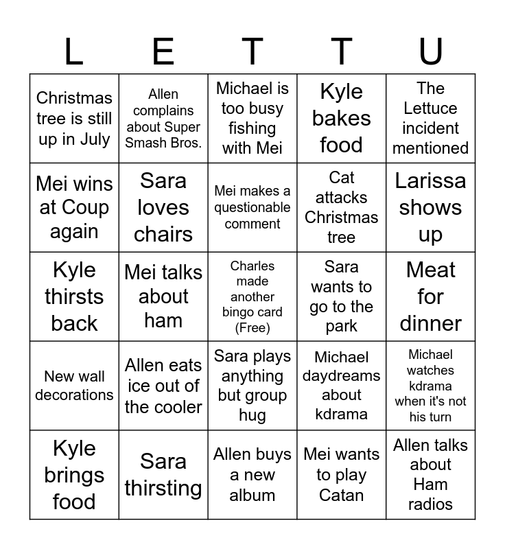 This bingo card has a free space and 24 words: Allen eats ice out of the cooler, Sara thirsting, Mei makes a questionable comment, Kyle brings food, The Lettuce incident mentioned, Christmas tree is still up in July, Mei wins at Coup again, Allen complains about Super Smash Bros., Sara wants to go to the park, Sara plays anything but group hug, Cat attacks Christmas tree, Kyle thirsts back, Michael daydreams about kdrama, Michael watches kdrama when it's not his turn, Sara loves chairs, Mei wants to play Catan, Meat for dinner, Michael is too busy fishing with Mei, Larissa shows up, Mei talks about ham, Allen talks about Ham radios, New wall decorations, Kyle bakes food and Allen buys a new album.