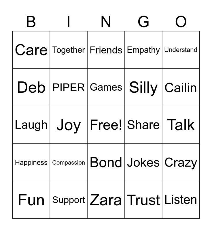 This bingo card has a free space and 29 words: Fun, Rainbow, Joy, Sunshine, Care, Friends, PIPER, Compassion, Share, Support, Talk, Listen, Zara, Trust, Cailin, Memories, Bond, Happiness, Understand, Laugh, Jokes, Elizabeth, Silly, Deb, Empathy, Together, Crazy, Games and Love.