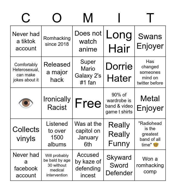 This bingo card has a free space and 24 words: Listened to over 1500 albums, Will probably be bald by age 30 without medical intervention, Super Mario Galaxy 2's #1 fan, Never had a facebook account, Swans Enjoyer, Never had a tiktok account, Comfortably Heterosexual, can make jokes about it, Romhacking since 2018, 90% of wardrobe is band & video game t shirts, Was at the capitol on January 6th, Dorrie Hater, 👁, Really Really Funny, "Radiohead is the greatest band of all time" 🤓, Released a major hack, Skyward Sword Defender, Metal Enjoyer, Does not watch anime, Has changed someones mind on twitter before, Ironically Racist, Won a romhacking comp, Collects vinyls, Long Hair and Accused by kaze of defending incest.