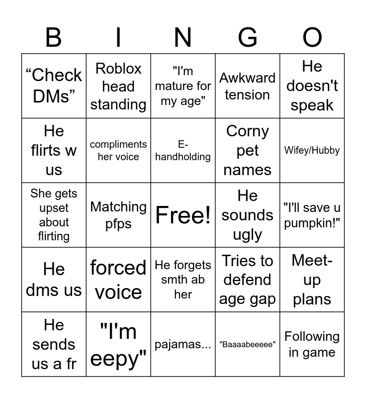 This bingo card has a free space and 24 words: forced voice, "I'm eepy", E-handholding, He sends us a fr, He doesn't speak, “Check DMs”, He flirts w us, Roblox head standing, He sounds ugly, He forgets smth ab her, Corny pet names, She gets upset about flirting, Tries to defend age gap, Meet-up plans, compliments her voice, "Baaaabeeeee", "I'll save u pumpkin!", "I'm mature for my age", Wifey/Hubby, Matching pfps, Following in game, He dms us, Awkward tension and pajamas....