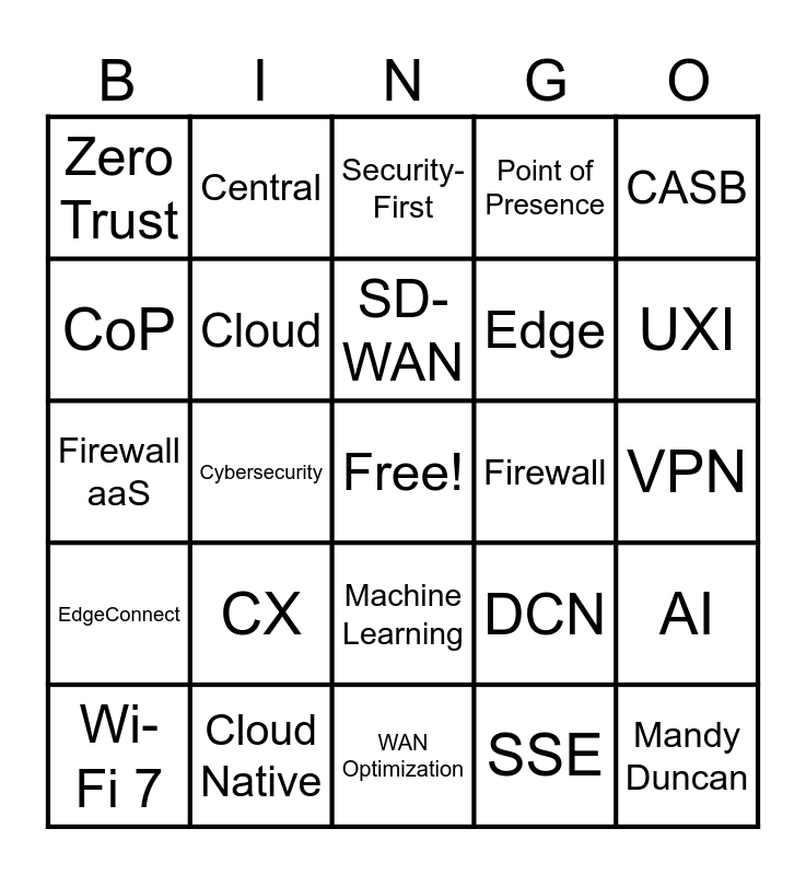 This bingo card has a free space and 24 words: Wi-Fi 7, CX, SD-WAN, SSE, CASB, Zero Trust, Central, Security-First, Firewall, VPN, Firewall aaS, Cloud, DCN, AI, CoP, Cloud Native, WAN Optimization, Point of Presence, UXI, EdgeConnect, Cybersecurity, Machine Learning, Edge and Mandy Duncan.