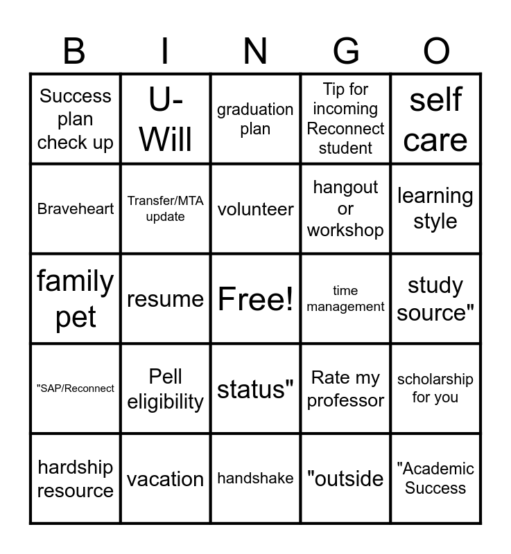This bingo card has a free space and 31 words: handshake, Career Services, resume, interest profiler, Success plan check up, graduation plan, Transfer/MTA update, Rate my professor, time management, "outside, study source", "Academic Success, Center", program contact, learning style, eLibrary, scholarship for you, Pell eligibility, "SAP/Reconnect, status", self care, food pantry, hardship resource, U-Will, hangout or workshop, Braveheart, Tip for incoming Reconnect student, family pet, vacation, volunteer and Student organization.
